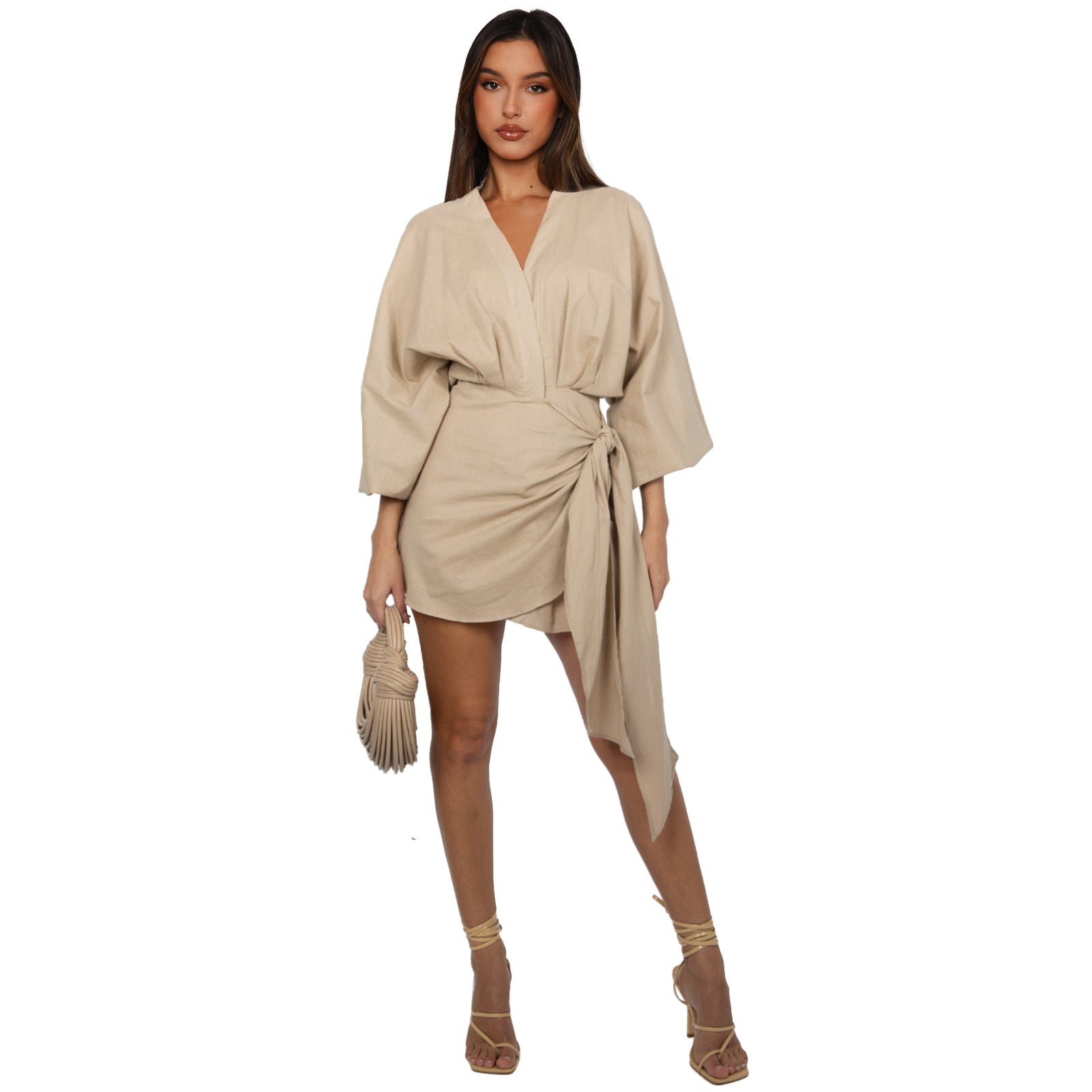 Trendiges Damen-Leinenkleid mit V-Ausschnitt & Schnürung – Laternenärmel, asymmetrischer kurzer Rock (Street Style)